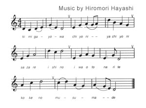 Kimigayo (The Japanese Anthem)Kimigayo is the Japanese national anthem based on a poem that is more than 1000 years old, written in the Heian Period (794-1185). This make the lyrics the oldest in the world for a national anthem. In 1869 an instructor in the British military band in Yokohama John William Fenton, wrote the music to accompany the poem. In 1880 the music was rewritten by Yoshiisa Oku and Akimori Hayashi and later on a German, Franz von Eckert, harmonized the song on behalf of the Japanese government. The song is approximately 40 seconds long.
